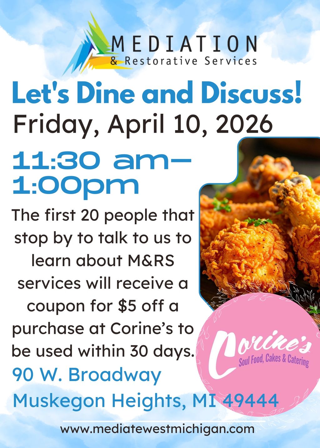 Let's Dine and Discuss on April 10th between 11:30am-1:00pm! The first 20 people that stop by and talk to us to learn about M&RS services will receive a coupon for $5 off a purchase at Corine's.